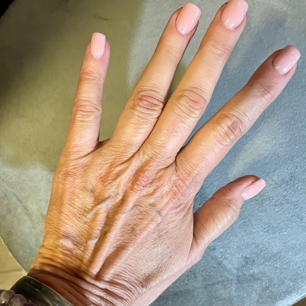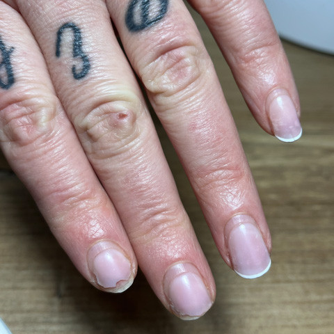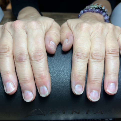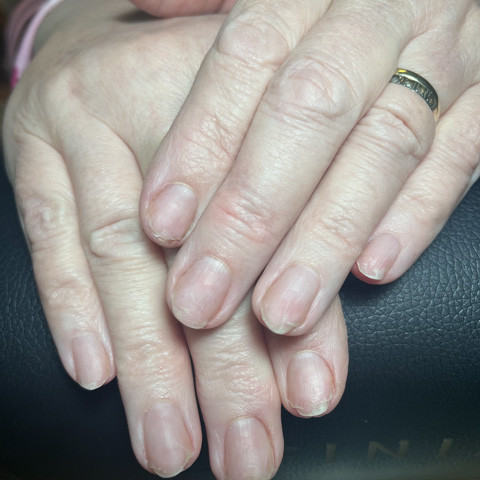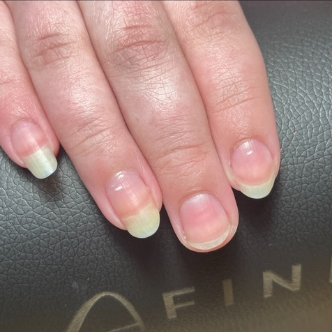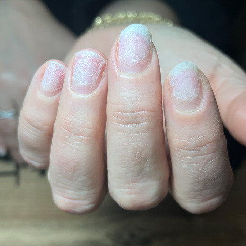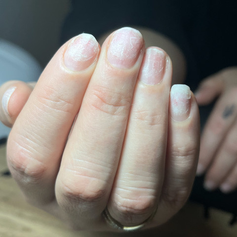 Kuukauden kuluttua oli odotettavissa heikko tilanne kynsien pysyvyyden suhteen, koska pohja oli niin kehnossa kunnossa. Kynsien ja ihon kunto oli parantunut huomattavasti hyvän kotihoidon ansiosta. Vahvistus huollettiin ja malli sai taas nauttia uusista kauniista kynsistä.